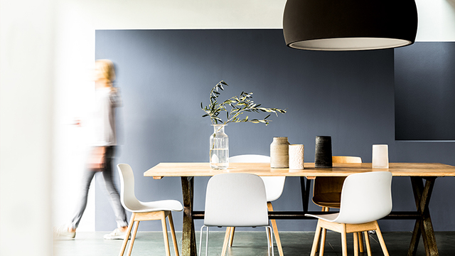 Trong hình trên, một khối màu xanh dương rực rỡ làm nổi bật khu vực ghế sofa trong phòng khách, trong khi sử dụng Màu Nâu Mật Nồng nhiều hơn, Màu sơn của JAMYL 2021, sẽ mang lại sự thực tế cho khu vực làm việc liền kề. Đồ nội thất đơn giản và chậu cây xanh mát trong nhà cho không gian thêm hoàn thiện và tương sáng.