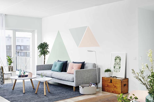 Tạo thêm nét yên bình cho phòng khách bằng cách sử dụng những màu sắc dịu nhẹ từ thiên nhiên.Bố trí một màu êm ái cho phông nền, ví dụ như màu xanh dương đậm và tạo thêm một lớp bằng những vòng tròn ấm áp để mang đến sự bắt mắt đầy thú vị đặc trưng riêng cho bức tường.