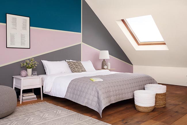 Đặt tông màu sống động trong phòng ngủ bằng cách thử nghiệm với nhiều khối màu sắc tương phản trên một bức tường. Để làm nổi bật các sắc thái, hãy tách riêng các hình khối với đường viền mỏng màu trắng. Sự kết hợp màu sắc mang lại sức sống và sự sinh động cho căn phòng, trong khi màu sắc tương phản sẽ lan tỏa năng lượng cho nhau.